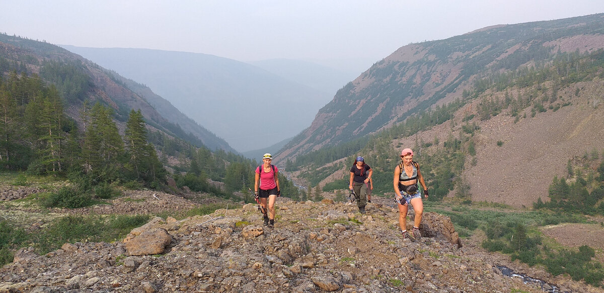 Сходили в баньку, наелись от пуза рыбных деликатесов, пора в пешку собираться. Единственное что нас останавливало это сделать с утра, это погода, был жуткий зной. Поэтому мы дождались вечера, когда жара немного спала, переправились на другой берег, запарковали катамараны и пошли. Понятное дело, троп там нет, если только звериные. Предстояло дойти до Гусиных озер на безымянной горе, от куда можно было ходить в радиалку до местных водопадов. Вылезли на открытый уступ горы уже за полночь, виды обалдеть, поужинали и улеглись спать. На утро предстоял еще подъем и там по плато до Гусиных озер около 15 км.