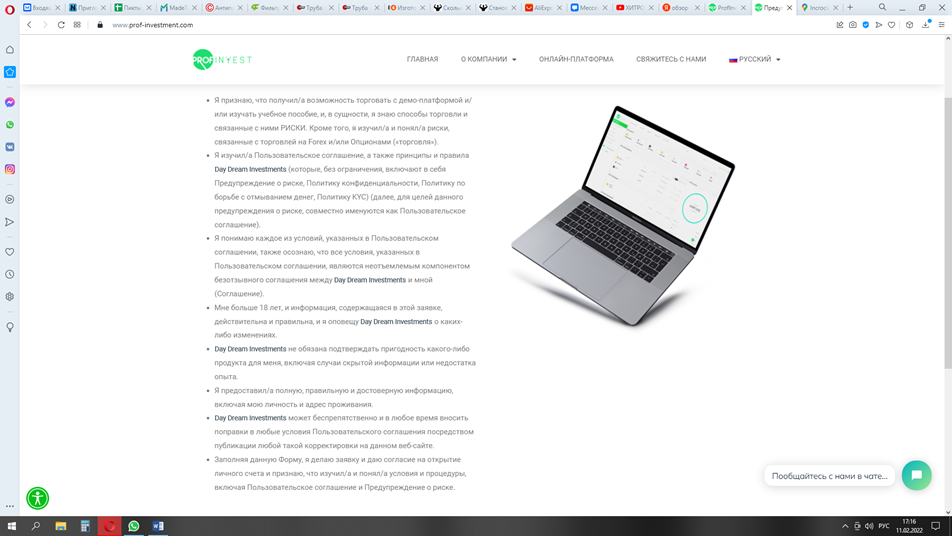 Подготовил краткий обзор на контору Prof-Invest, которая позиционирует себя, как брокера для Форекс. Первым делом я проверил интересный пункт «О рисках». Конечно, здесь все описано правильно, торговля и инвестиции – это высокая вероятность прогореть, потерять вообще все вложения. Но один из пунктов гласит, что компания может без предупреждения изменить пользовательское соглашение, а для подтверждения правомерности этого ей достаточно опубликовать новую версию на этом сайте. То есть, помимо нулевой ответственности за финансовую часть и ваши вложения, фирма может в любое время изменить условия так, как ей нужно. Это как минимум подозрительно. Контактные данные: · +79534423794; · sp.prof-investment@mail.ru. Другой интересный сюрприз ждал меня при попытке открыть онлайн-платформу. Страница была пустая, видимо после последней блокировки админы еще не успели ее собрать. В любом случае, это говорит о том, что компания появилась недавно, либо относится к своему ресурсу безответственно. Поль