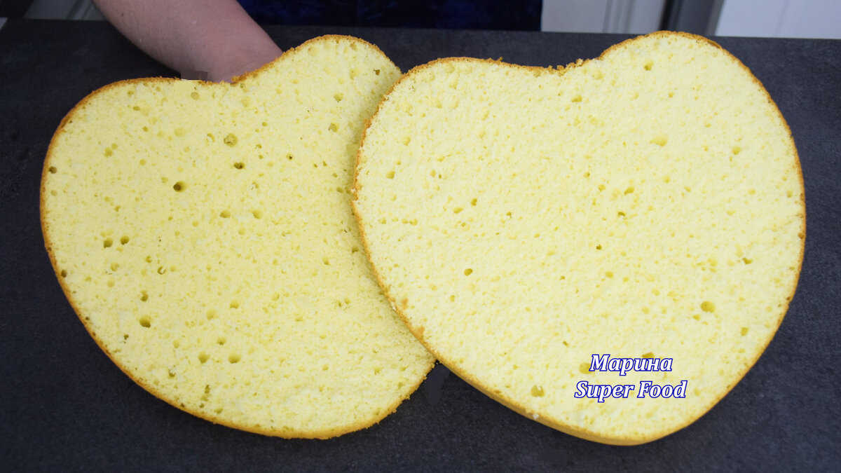 Здравствуйте! Сегодня я сделаю замечательный Бисквит, который можно использовать для приготовления любого торта или различных десертов. Получается он пышный, высокий, в меру сладкий и очень мягкий. Удачный рецепт! ПРОДУКТЫ ДЛЯ РЕЦЕПТА, А ТАКЖЕ ВИДЕО РЕЦЕПТ ВЫ НАЙДЁТЕ В КОНЦЕ ЭТОЙ СТАТЬИ. 1. Выпекать такой бисквит я буду в форме в виде сердца (размером 25 х 25 см), но его можно без проблем приготовить и в любой форме. На дно формы стелю бумагу для выпечки. По бокам смазываю слегка сливочным маслом. 2. Пшеничную муку смешиваем с разрыхлителем. Хорошо перемешаем и пока оставляем. 3. Отделим яичные белки от желтков. Старайтесь делать это аккуратно, чтобы в белки не попал желток. В белки всыпаем щепотку соли и ванильный сахар. Начинаем взбивать до мягких пиков. 4. Всыпаем примерно 1/3 часть из общей нормы сахара и продолжаем взбивать пару минут. 5. Теперь всыпаем крахмал, продолжаем еще взбивать 3 минуты. 6. Можно убедиться в достаточной степени взбивания белков следующим образом: просто пе