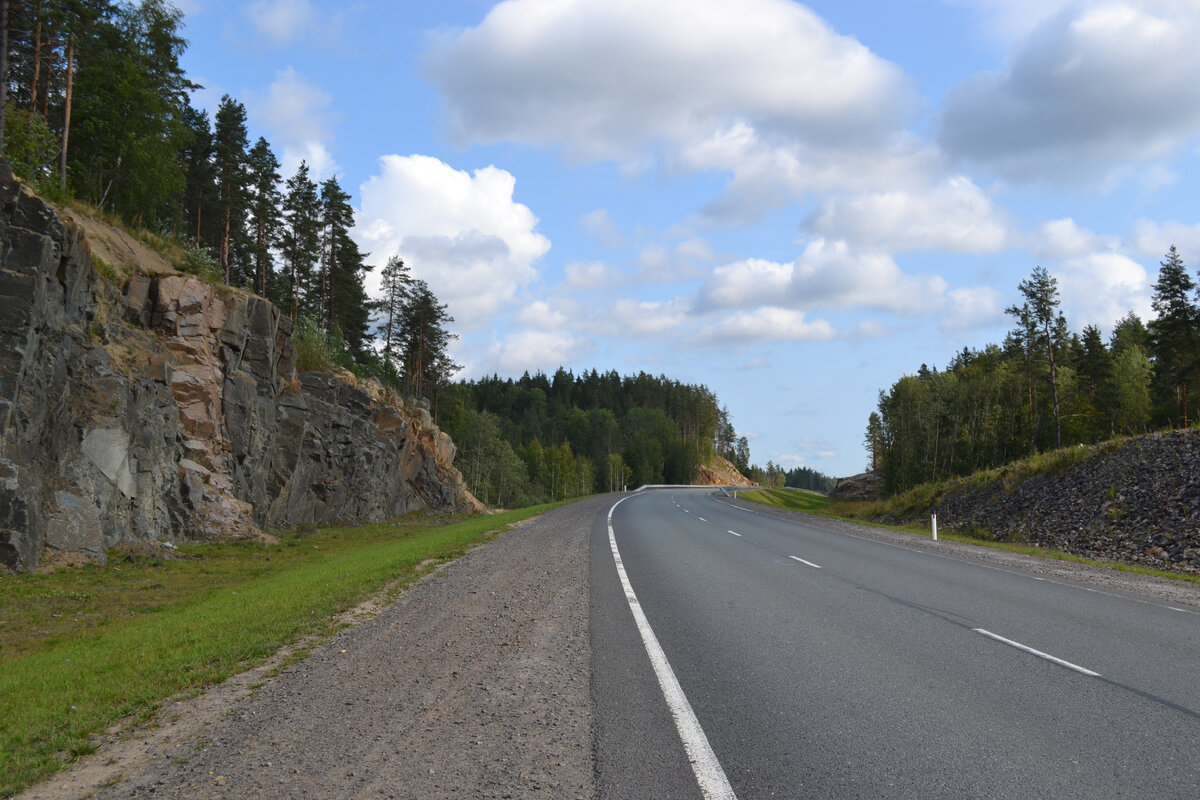 Дорога тем временем просто шикарная, ровный асфальт, прекрасные виды. Но... серпантин. Блин, на равнинах Карелии. Подъем, вдруг резкий поворот под 90 градусов и спуск. А еще бензин выплескивается из полного бака. Ыыыыыы. Через 30 минут я почувствовала себя первым водителем, которого укачивает за рулем.