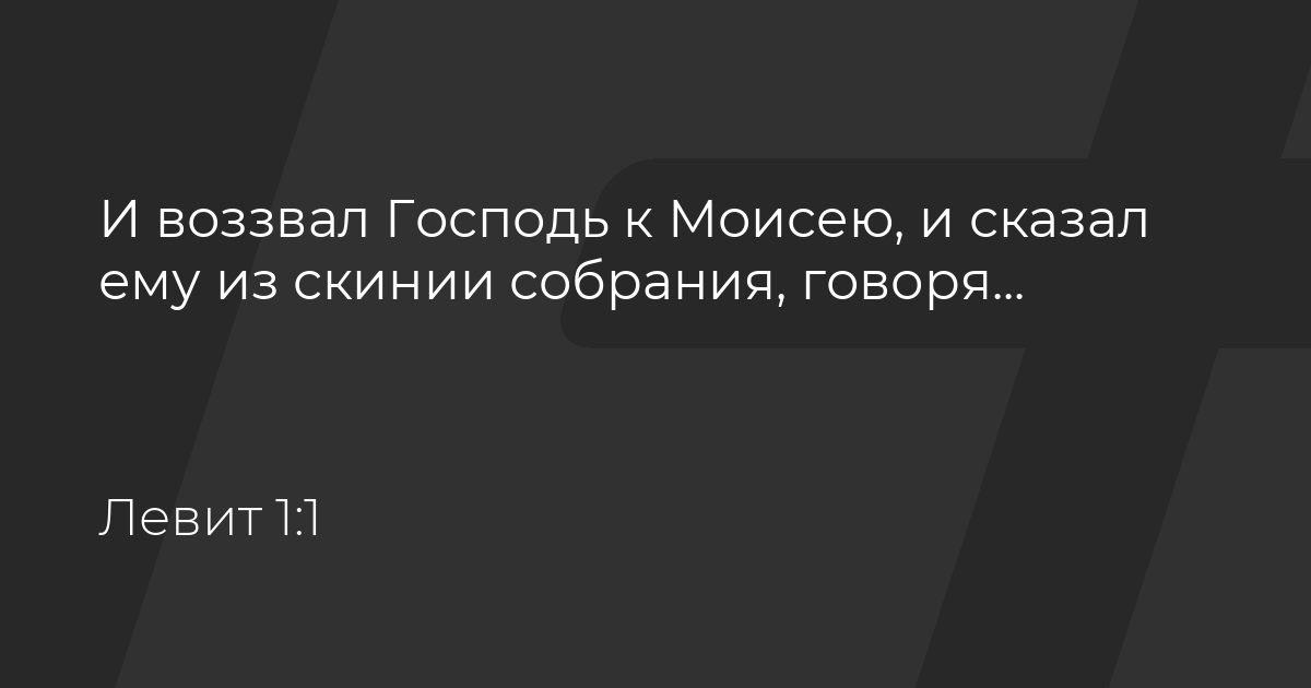 «И воззвал Господь к Моисею и сказал ему из скинии собрания, говоря: “Объяви сынам Израилевым и скажи им: когда кто из вас хочет принести жертву Господу, то, если из скота, приносите жертву вашу из скота крупного и мелкого”» (Лев. 1:1, 2). В начале книги ясно даётся понять, что источником идущих далее законов был Сам Господь. Стих 1. В еврейском варианте книга начинается с союза «и», что наводит на мысль о том, что эта книга является продолжением книги «Исход». Затем первый стих задаёт тон всей книге, говоря, что Бог воззвал к Моисею и велел ему обратиться к народу. Снова и снова в книге «Левит» подчёркивается тот факт, что источником законов, регулирующих повседневную жизнь и религию Израиля, был Сам Бог и что Бог дал Свой закон через Моисея. Те, кто отвергает тот факт, что законы книги «Левит» были открыты Богом Моисею, отвергают истинность этих ясных утверждений. Бог говорил к Моисею из скинии собрания. Слово «скиния» указывает на её конструкцию: это была «палатка», переносная конст