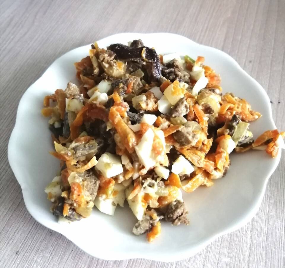 Ингредиенты: Куриные сердечки, Яйца , Лук, Морковь, Соль, перец, Майонез Способ приготовления: Куриные сердечки отварить. Пока варятся сердечки, отвариваем яйца и режем их кубиком. Морковь и лук почистить. Морковь натереть на крупной тёрке. Лук режем и обжариваем вместе с морковью. Сердечки режем и смешиваем с морковью, луком и яйцом. Солим, перчим, заправляем майонезом.