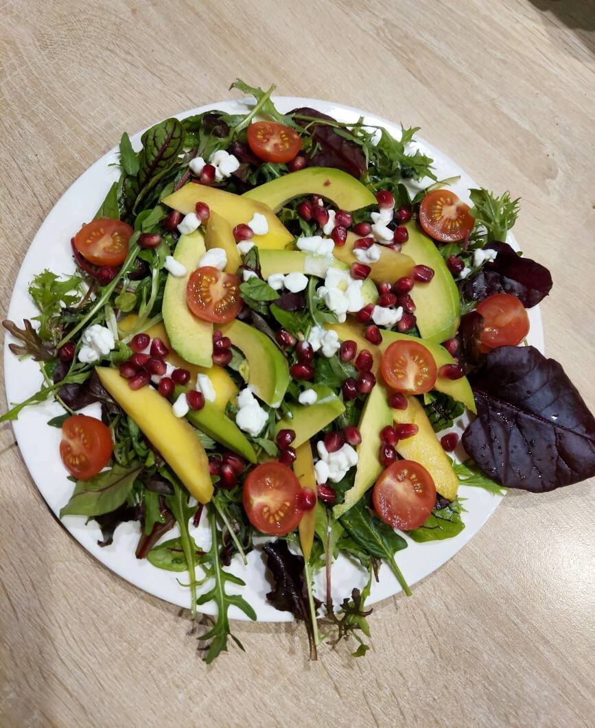 Очень вкусный, легкий салат. Необычное сочетание продуктов, интересная заправка, подходит и для праздничного стола и как ежедневное блюдо. Ингредиенты: авокадо, манго и лимон по, помидоров черри, салатная смесь, творога зерненого, зерна граната , масла растительного, сахар, соль, горчица перец черный молотый Способ приготовления: Приготовить заправку. Из лимона выдавить сок, процедить через сито в баночку. Добавить масло, сахар и горчицу, поперчить, посолить. Плотно закрыть крышкой и взболтать, чтобы заправка хорошо перемешалась и получилась однородная масса. Сложить в салатник вымытую и хорошо подсушенную зелень, порезанные на половинки помидоры черри, нарезанные длинными дольками авокадо и манго. Добавить размятый вилкой творог и слегка перемешать. Посыпать салат зернышками граната и полить лимонной заправкой.