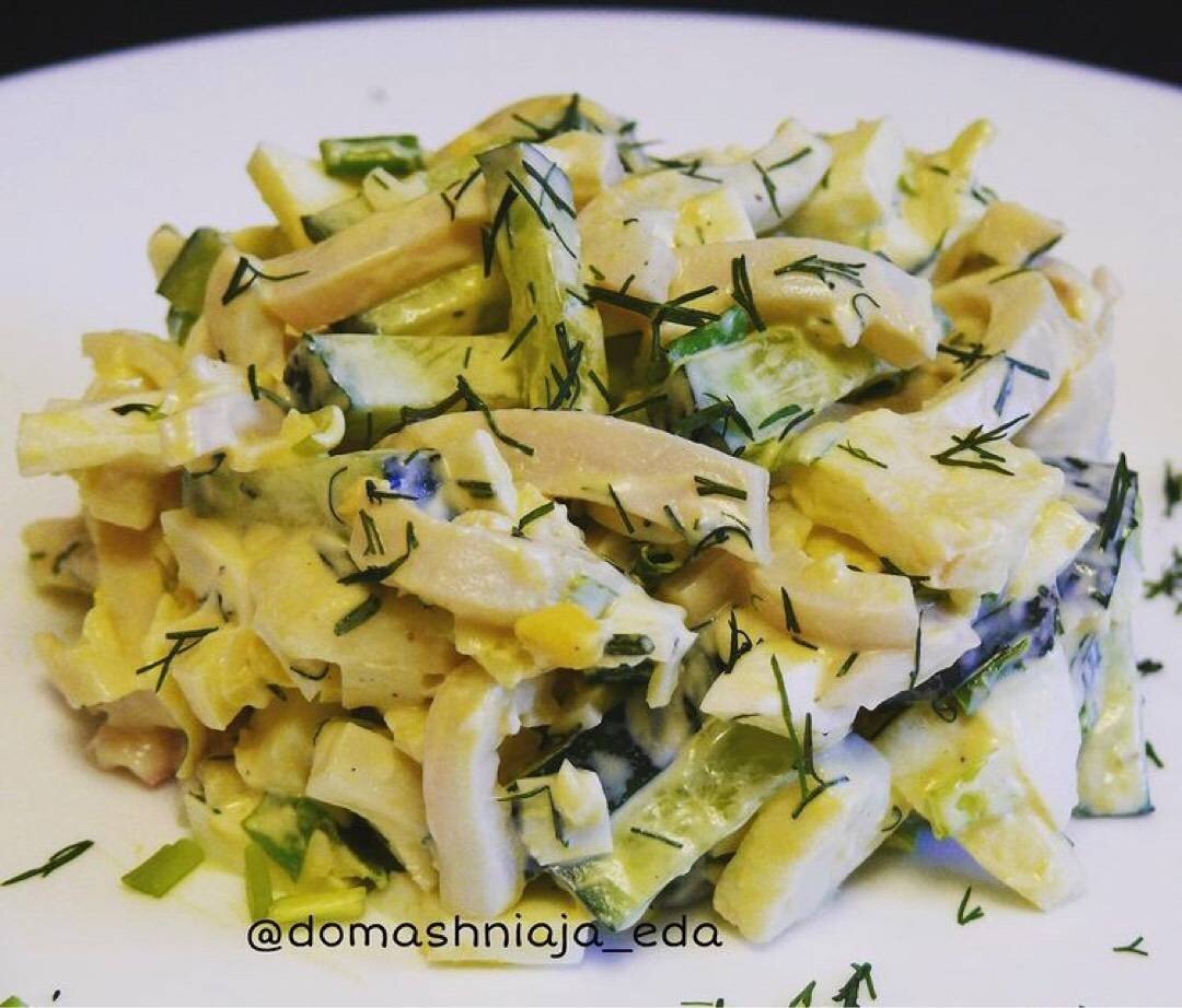 #салат #кальмари #салатзкальмарами #морепродукти Ингредиенты: тушки кальмаров, вареных яйца, крупный свежий огурец, небольшое яблочко, твердого сыра, зеленый лук, укроп, соль, перец, майонез для заправки (у меня домашний) Способ приготовления: Прежде всего, нужно подготовить кальмаров: разморозить, отварить и очистить. Кальмаров по очереди опустить в кипящую воду на 10-15 сек, затем обдать холодной водой и смыть свернувшуюся кожицу. Удалить внутренности и хитиновую хорду. Подготовленных кальмаров залить кипятком на 30-40 сек и снова обдать холодной водой. Когда кальмары остынут, нарезать их соломкой. Яйца очистить и нарезать соломкой. Яблоко и огурец тоже нарезать соломкой. Сыр натереть на крупной терке. Зеленый лук и укроп порубить. Все продукты соединить, приправить солью, перцем, перемешать, заправить небольшим количеством майонеза и сразу же подать на стол. Всем приятного аппетита! Если взять только кальмаров, яйца, огурец и зеленый лук, и все это заправить майонезом, тоже будет вк