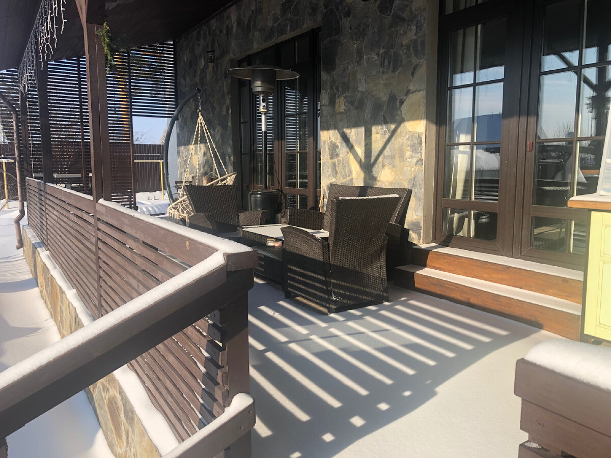 Один единственный существенный минус, который я признаю, это необходимость убирать снег зимой. Особенно важно делать это при оттепелях, чтобы растаявший снег не превратился в лед и не повредил плитку, уложенную на полу веранды. Для этого нужно продумать уклон и возможность отвода воды с веранды.