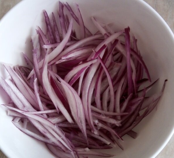 Рецептов салатов великое множество: овощные, фруктовые, рыбные и мясные. Кому по душе сытные и быстрые салаты из 4-х простых ингредиентов, то делюсь рецептом. Нарезал, смешал с соусом или майонезом - и можно приступать к дегустации. Красный лук (можно и обычный репчатый) я тонко нарезаю соломкой и минут на 10-15 залью кипяченой водой комнатной температуры с добавлением 1/2 чайной ложки яблочного уксуса. Замариную, одним словом. Отварную свеклу (можно запеченную) нарежу соломкой. Также нарежу сваренную заранее печень (говяжья). Еще нужны маринованые огурцы. Количество всех ингредиентов произвольное, по вашему вкусу. И начинаю собирать наш салат. Свекла. Лук уже готов после маринования. Добавляю нарезанную печень в салатницу. И огурчики. Если вы их любите и кладете побольше, то солить салат не надо. Можно добавить черный перец. Теперь о заправке. Можете просто майонезом заправить. И перемешать. А я обычно смешиваю майонез со сметаной в равных долях. А если есть под рукой готовая горчица