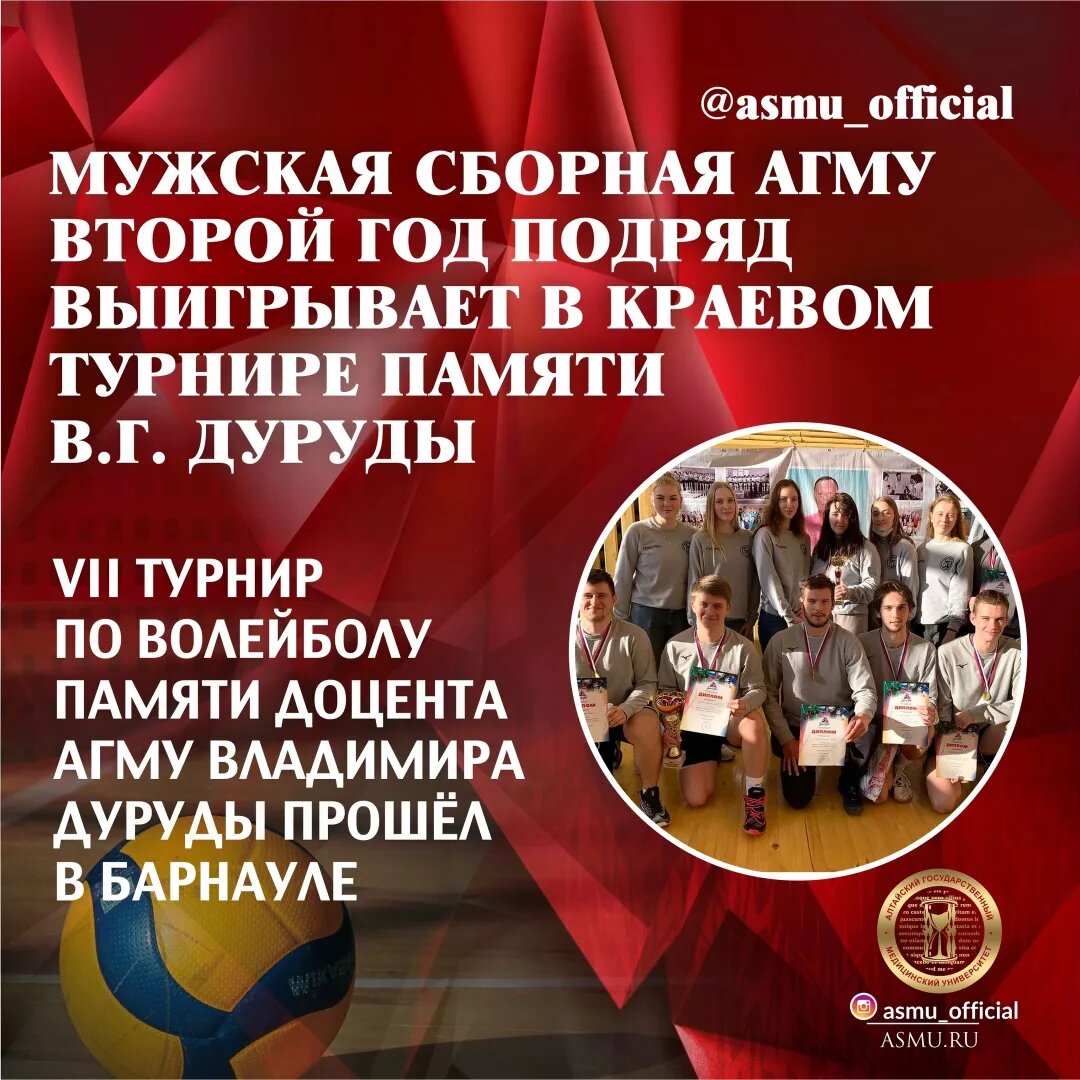 Мужская сборная АГМУ второй год подряд выигрывает в краевом турнире памяти В. Г. Дуруды . VII турнир по волейболу памяти доцента АГМУ Владимира Дуруды прошёл в Барнауле. . Открывая состязание, проректор по международной деятельности АГМУ Алексей Резинкин, поприветствовал спортсменов и пожелал красивой игры. . "Так как с 2022 года к традиционным организаторам – спортивному клубу, кафедре физической культуры и ЗОЖ АГМУ – присоединились министерство спорта Алтайского края и краевая Федерация волейбола, турнир получил статус «краевое соревнование». Это очень важный шаг для сохранения памяти о Владимире Гавриловиче, который проработал 44 года наставником мужских и женских сборных команд по волейболу нашего вуза", – сказал Алексей Резинкин. . Также с приветственными словами обратился президент Федерации волейбола Алтайского края Егор Тейхреб, объявив минуту молчания в память о человеке, который вписал золотыми буквами свое имя в волейбольную летопись Алтайского края. . Примечат