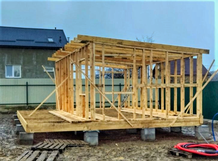 Далее начали возводить каркасы стен, укрепляя их дополнительно укосинами. Это такие деревянные рейки, что крепятся под углом относительно опорных досок. Они придают всей конструкции дополнительную прочность и устойчивость вообще, и к природным катаклизмам - в частности. В нашем штормовом климате это особенно важно. Напомню, речь идёт о Калининградской области.