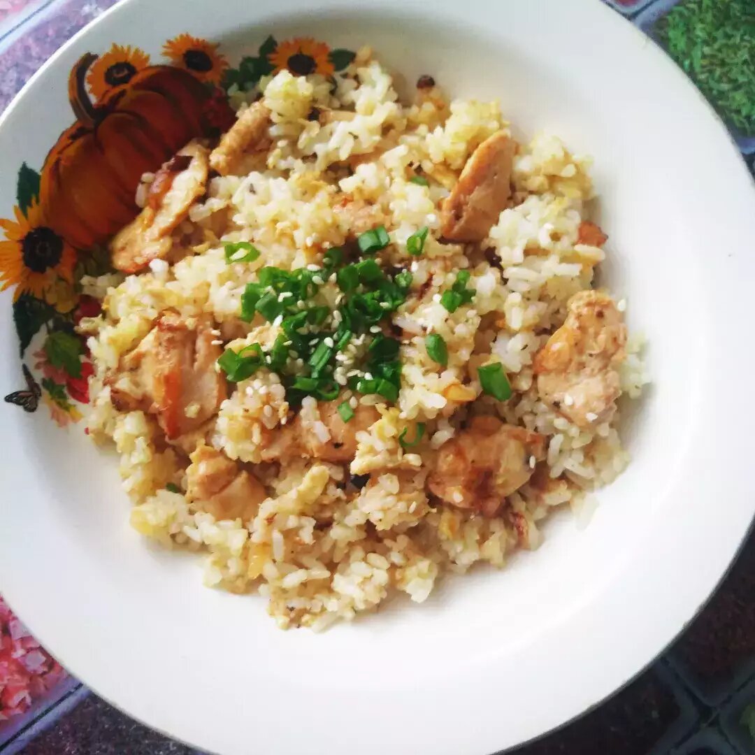#23февраля Ингредиенты: риса, куриного филе, луковица, яйцо, Соль , соевого соуса, горчицы, Имбирь сушеный , Карри , растительного масла, Чеснок сушеный , Перец чёрный молотый , Кунжут и зелёный лук по желанию для подачи Способ приготовления: Рис отварить до готовности в подсоленной воде. Курицу нарезать небольшими кусочками, заправить соевым соусом и горчицей, дать постоять 15-20 минут. Луковицу очистить и нарезать, как любите, у меня мелко. Разогреть сковороду с растительным маслом и слегка обжарить лук. Добавить к луку курицу, специи и обжаривать до готовности курицы. Когда курица будет готова, разбить в пиалу яйцо, разболтать и влить в курицу, сразу перемешать. Готовый рис добавить к курице с яйцом, перемешать, оставить на 10 минут под крышкой на медленном огне. Если вам покажется суховато, можно добавить ещё немного масла. При подаче, по желанию, можно украсить кунжутом и зелёным луком. Приятного аппетита!