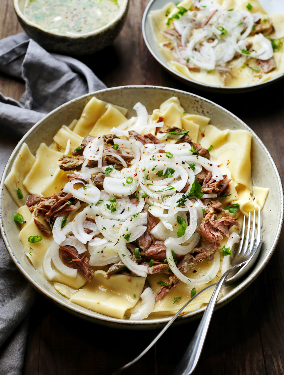 Традиционное, часто праздничное блюдо тюркских народов, особенно популярное у киргизов и казахов. Чем важнее повод торжества и богаче стол, тем больше мяса будет в блюде. Кроме баранины в бешбармак традиционно добавляют конину и колбасу из неё. В наши дни блюдо немного изменилось, потому что конину и конскую колбасу не везде можно найти, да и не все это едят. Поэтому бешбармак чаще готовят только из баранины, допустимы и альтернативные варианты с говядиной или другими видами мяса. Для насыщенного бульона лучше использовать мясо на кости. В готовое блюдо добавляют лук, ошпаренный кипящим бульоном, иногда редьку, нарезанную тонкой соломкой. Лук можно отварить до прозрачности, но вкуснее, когда он чуть упругий, просто потерявший остроту и горечь. При желании при подаче можно влить немного уксуса, особенно такая рекомендация понравится тем, кто любит добавлять уксус к пельменям. Лапша в этом блюде — замена хлеба. Кроме неё в бешбармак можно добавить и отварную картошку. на 4–6 порций 700 г