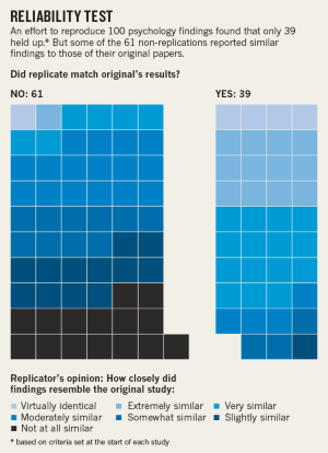 При более строгом взгляде, картина складывается ещё более печальная. Несмотря на то, что в 97% оригинальных исследований сообщалось об обнаружении значительного эффекта, только в 36% повторений удалось получить значимые результаты. Кроме того, в среднем эти результаты были вдвое менее значимы, чем в оригинальных публикациях.