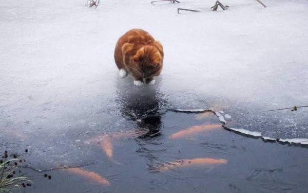 Огромная трещина пробежала с двух сторон, вдоль берега по толстым льдинам. Рыбаки, закричав побросали всё и бросились бегом к берегу. Попытался выбраться и хозяин котов, но.