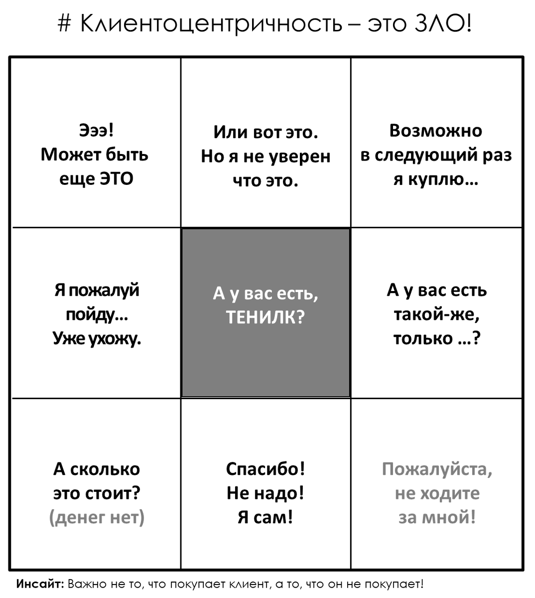 Нет более нелепой фразы, чем "Клиент всегда прав". Видимо сначала эта была шутка, кто-то хотел разорвать шаблон, но что-то пошло не так и после многочисленных повторений, добавлений и исправлений... История кстати умалчивает первоначальную формулировку, возможно она была совершенно другой, например: "У меня есть босс!" или "Я здесь главный!" или "Вы всего лишь гость!" или "Вы сами не знаете чего хотите!". Ориентироваться вокруг клиента это значит сужать свой взгляд на бизнес до чувств и эмоций случайного человека, которому важно, чтобы вы быстрее его обслужили да подешевле, и не выносили ему мозг расспросами и приложениями. А дальше он воспользуется услугами других компаний, коих на рынке миллионы. Да и другие всегда предложат что-то новенькое да со скидкой. К тому же каждый из нас порой сам не знает зачем ходит в магазин или что хочет купить, чтобы обрести ощущение смысла жизни или счастья, и тем более этот экзистенциональный вакуум не сможет заполнить случайный сотрудник работающий