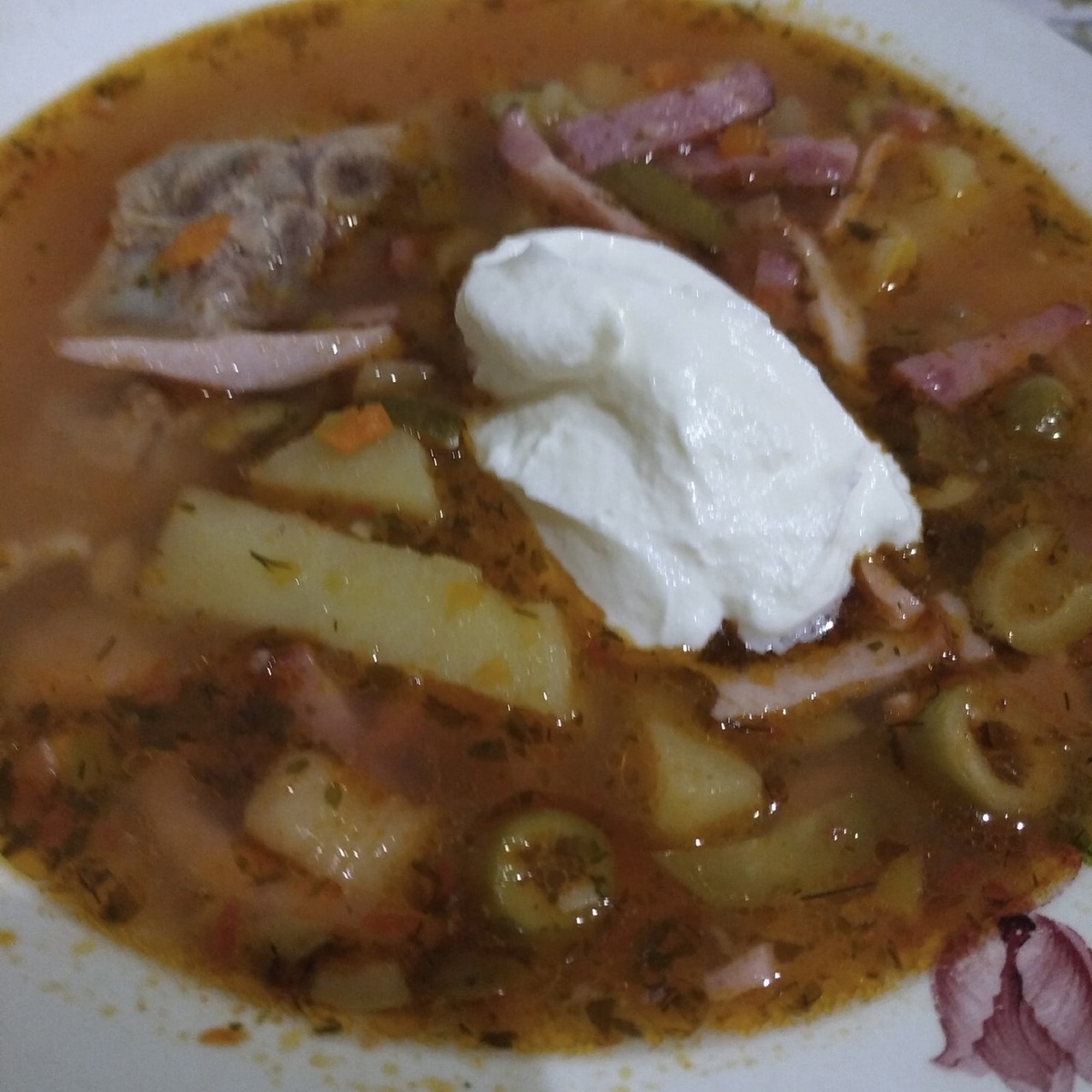 Такой вид супа получается всегда очень наваристым и вкусным. А легкая кислинка свежего лимона и солененьких огурчиков придает особенную неповторимость. А готовится солянка очень просто, главное соблюсти небольшое правило, но обо всем по порядку. Варить солянку, я Вам скажу, не дольше обычного супа. Для начала сварим хороший бульон. Можно использовать любой вид мяса на кости, так бульон получится более наваристым. После закипания мяса, всю воду сразу же сливаем и заливаем повторно. Так бульон получается более прозрачным, а на вкусе это никак не отражается, если только в лучшую сторону. Пока варится мясо, подготовим различные виды колбас. Их должно быть, по крайней мере, несколько для более сложного вкуса. И не жалейте колбасы, а то будет плавать парочка небольших кусочков непонятно из чего. И это самый главный секрет вкусной солянки: колбасы берем много и разного вида. Я взяла варено-копченую свинину, вареную и копченую колбасы. Нарезаем все небольшими брусочками и отправляем вариться