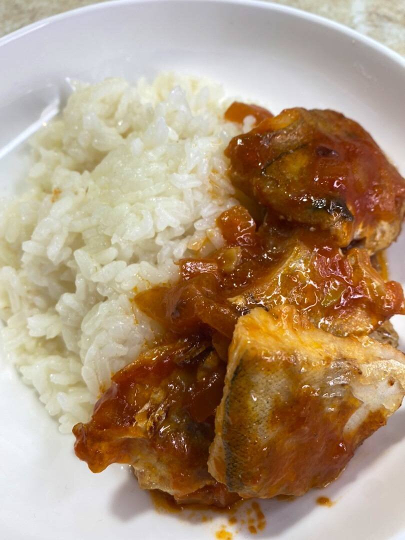 Очень простое блюдо из рыбы. Ещё оно делается очень быстро и из минимального количества продуктов. Очень советую добавить сахара. В принципе, где есть помидоры или томатная паста всегда нужно добавлять сахар. Так вы добавите ту недостающие сладость, которая сделает вкус насыщенней. Ингредиенты: Филе белой рыбы, Томатной пасты, Лук, Соль, сахар и перец Способ приготовления: Лук нарезать мелко и обжарить на растительном масле. Добавить томатную пасту и немного воды. Также добавить соль, сахар и другие специи. Все перемешать и немного потушить. Отложить смесь в сторону. Филе рыбы обжарить. Переворачивать её аккуратно лопаточкой. Затем добавить нашу томатную смесь и вместе с ним немного потушить. Я подаю с рисом, но вы можете выбрать другой гарнир.