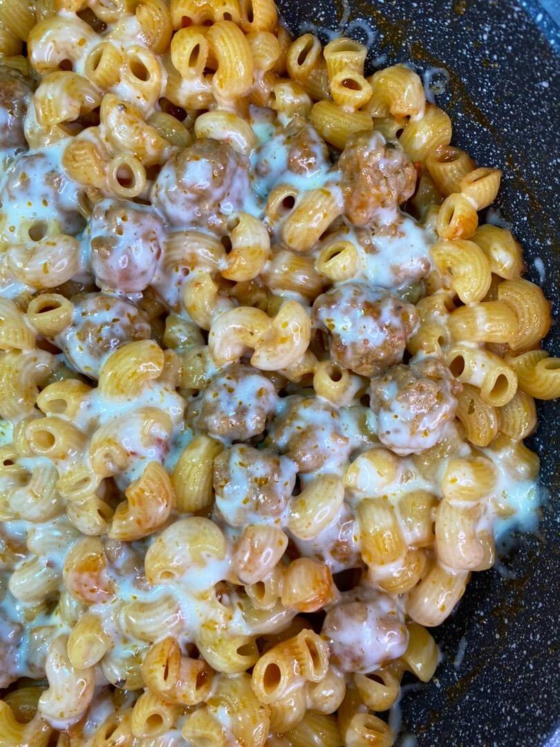 Ингредиенты: Паста, Фарш, Томатный соус, Сыр, Соль,специи, Вода Способ приготовления: Фарш посолить, и отбить. Сформировать шарики. Обжарить на растительном масле. Добавить пасту (сухую), томатный соус и воду, чтобы покрывала пасту на 1 см. Тушить на медленном огне до готовности пасты. При необходимости подлить воды.