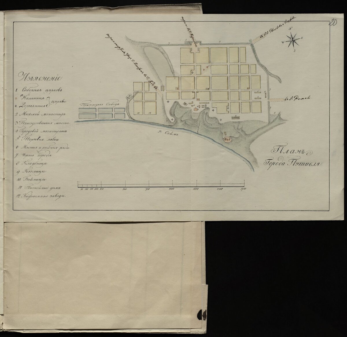 7. Судоходство речки Сейма, при котором могли бы быть два Губернских города: Курск и Путивль, непременно принесет величайшую выгоду, ибо от Путивля, река Сейм усиленная притоками, многих впадающих в нее рек, во всякое время может быть судоходною, и как Путивль имеет столько удобств к жизни и находится в недальнем расстоянии от впадения реки Сейма, в судоходную Десну, то вероятно привлечь к себе промышленников с большими капиталами, и сделается посредником торговли окружающих его Губерний с Одессою и всем краем, покоторому протекают Десна, Днепр и Западная Двина, а если капиталисты устроят магазины при Березенском канале, то из Губерний окружающих Путивль в одно место можно доставлятся хлеб до сих магаазинов и в следующую вину наприготоволенных там судах перевезется в Северный Край России, тогда ценность на него уровняется во всем Государстве и никогда уже не может случится того не счастья которое испытал этот край в не урожайные годы, Правительство же не будет в необходимости дозволять беспошлинный привоз хлеба из заграницы, как в настоящее время случилось в Эстляндии и когда в тоже время в средней полосе России хлеб не куда Сбывать. Если же соединить еще Десну с Окою, посредством ли судоходных рек Болвы и Жиздры, между коими и предполагалось некогда прокопать канал, что преимущественно пред всеми проектами, одобряясь даже и покойным инженер-генералом Деволаном, или железною дорогой как признается за удобнейшие, тогда одно из самых плодороднейших пространств средней полосы Империи, будет иметь сообщения с Москвою и всем краем нуждающимся в хлебе, значительная же часть Средней и Южной России, безпрепятственно будут получать все то, что привозится на Нижегородскую ярмарку, да и самый арсенал, находящийся в Брянске, приобретет большия способы в получении материалов и доставлении орудий. Тогда хлебопашество в средней полосе России, поощряемое хорошим сбытом произведений, улучшится неприменно, но но ныне остается оно в пренебрежении, потому что ежели комерчески расчесть, сеять хлеб от совершенный убыток и хозяйство не приносящих дохода, лишает владельцов возможности привести оное в лучшее состояние .