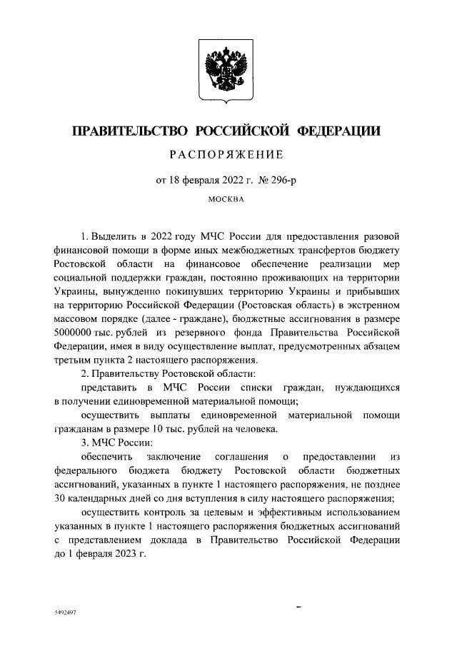 Правительство выделило МЧС РФ 5 млрд руб для финансовой помощи властям Ростовской области на выплаты в 10 тыс руб беженцам из Донбасса. Также глава ДНР Пушилин призвал всё мужское население прибыть в военные комиссариаты.
