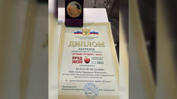 «Сады Карачаево-Черкесии» завоевали золотую медаль в 29-й международной выставке продуктов питания «Продэкспо- 2022». В номинации «Лучший продукт» золотой медалью была отмечена груша помологического сорта «Ксения». Напомним, «Продэкспо» - крупнейшая международная выставка продуктов питания и напитков в России и Восточной Европе. Выставка проходила в Москве, свою продукцию представляли более 2000 компаний из 54 стран мира.
