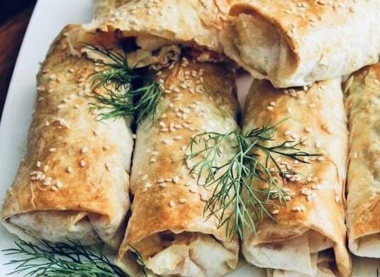 - Приготовление: Яйца отварить вкрутую и натереть на крупной терке. Лук нарезать тонкими колечками. Смешать яйца, сыр, лук, сметану и специи. Лаваш разрезать на прямоугольные кусочки (примерно 10*18). По краю короткой стороны выложите начинку. Сверните аккуратные трубочки, выложите на противень, смажьте яичным желтком и посыпьте кунжутом. Выпекайте в разогретой до 200 градусов духовке около 15 минут. При подаче можно посыпать свежей зеленью