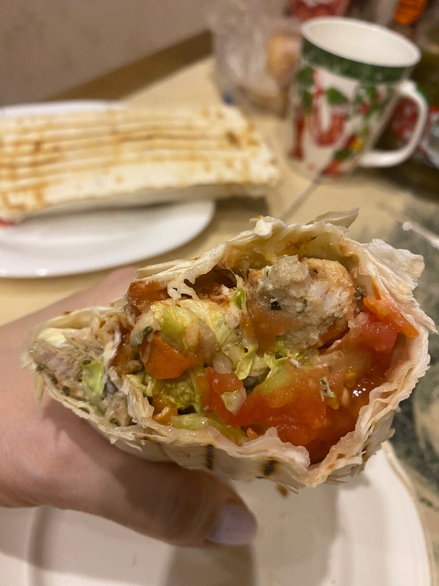 На перекус, сегодня, шаурма с куриным и свиным филе, с добавлением грибов и сыра!