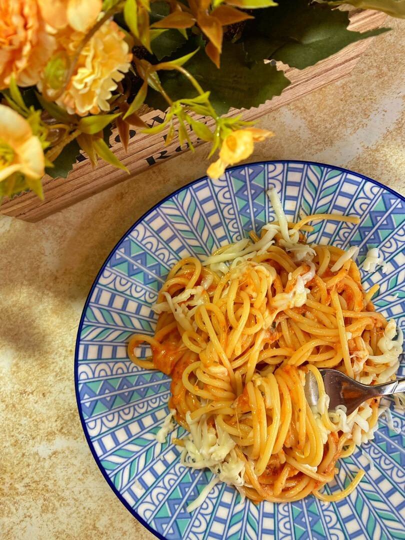 Ингредиенты: томаты в собственном соку, чеснока, спагетти, моцарелла, специи итальянская, соль и сахар Способ приготовления: Пасту сварит по инструкции на упаковке. Томаты пробить блендером с чесноком. Прогреть со специями, солью и сахаром. Добавить пасту, перемешать. Всыпать часть тертого сыра. Перемешать и выложить на тарелку. Сверху посыпать оставшимся сыром.