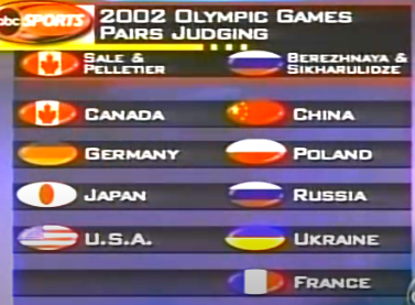 Канадская пара Сале-Пеллетье проиграла золото нашей паре Елене Бережной - Антону Сихарулидзе всего одним голосом. Вот так распределились голоса судей по странам.