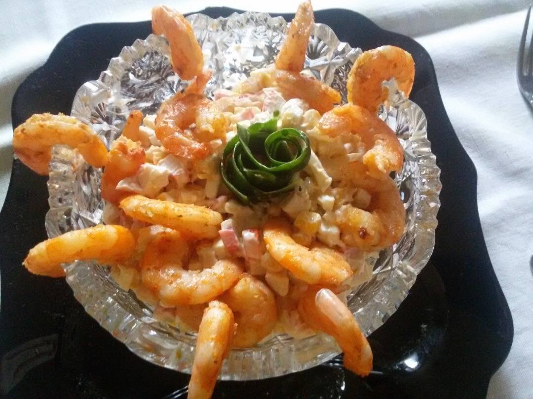 #23февраля Ингредиенты: крабовых палочек или крабового мяса, консервированная кукуруза, яйцо куриное, креветки, майонез, соль Способ приготовления: Крабовые палочки мелко нарезать. Яйца сварить и также мелко покрошить. Креветки отварить в соленой воде 3-5 мин. после закипания, откинуть в дуршлаг, остудить, почистить, оставить несколько шт для украшения, остальные измельчить. Банку кукурузы открыть, слить жидкость. Объединить все ингредиенты, посолить по вкусу и заправить майонезом. Выложить в салатник и украсить креветками. Приятного аппетита!