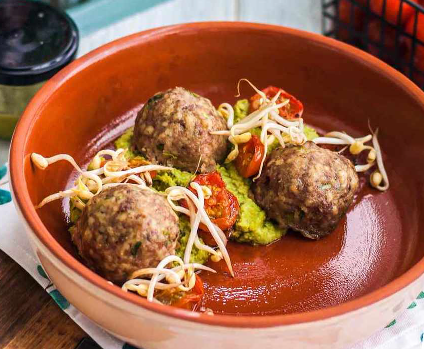 Тефтели из индейки с мятным пюре из зеленого горошка и запеченными томатами