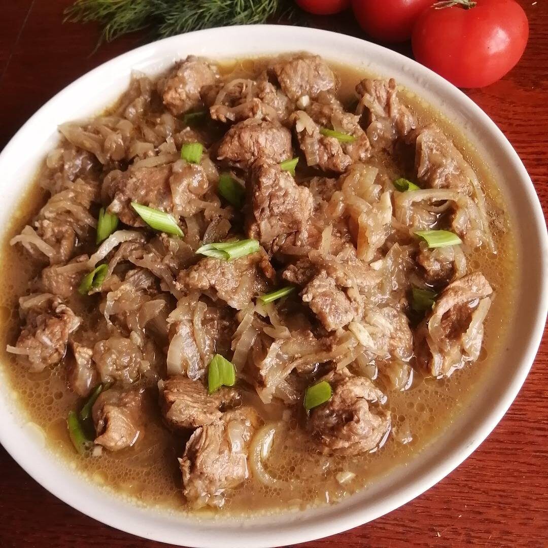 #23февраля Очень простое в приготовлении, но очень вкусное, сочное, нежное мясо, которое тает во рту. Ингредиенты: говядины, лука репчатого, масла сливочного, чеснока, воды, уксуса яблочного, сахара, соли, Перец чёрный молотый Способ приготовления: Говядину промываем, обсушиваем, нарезаем на кусочки Лук нарезаем полукольцами. В посуду с толстым дном выкладываем говядину, сверху слой лука, наливаем воду, выкладываем масло, нарезанное на мелкие кусочки. Накрываем крышкой и тушим на слабом огне около 1 часа. По истечении времени к мясу добавляем нарезанный чеснок, сахар, уксус яблочный, перец чёрный молотый, соль. Количество соли регулируйте по своему вкусу. Перемешиваем и тушим ещё примерно час на слабом огне под крышкой.