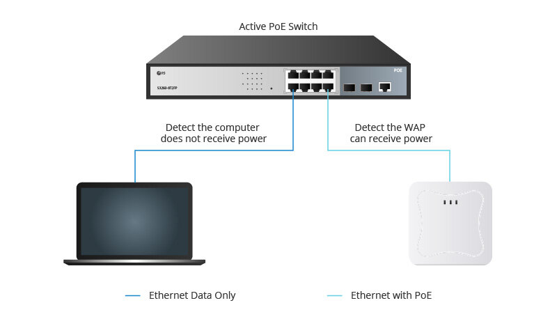 Активный PoE, сокращенно от Active Power over Ethernet, также известен как стандартный PoE, который относится к любому типу PoE, который согласовывает надлежащее напряжение между оборудованием источника питания (PSE) и устройством PD. Коммутатор Active PoE — это устройство, соответствующее стандарту PoE, поэтому его также называют стандартным коммутатором PoE. Этот тип коммутатора соответствует стандартам IEEE 802.3af, IEEE 802.3at или IEEE 802.3bt. Таким образом, его можно разделить на коммутаторы PoE, PoE+ и PoE++ (коммутатор PoE, PoE+ и PoE++: как выбрать?). Перед включением активный коммутатор PoE проверит , совместима ли электрическая мощность между коммутатором и удаленным устройством. Если это не так, активный коммутатор PoE не будет подавать питание, предотвращая любое потенциальное повреждение устройства без PoE.