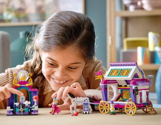 Игровой набор из серии LEGO Friends предлагает отправиться вместе с Мией на волшебную ярмарку, где она сможет узнать свою судьбу, заглянув в волшебный шар. Ярмарка встречает подружку необычной белой совой с желтым оперением и желтыми глазами. Сова присела на красивую вывеску с голографическим изображением гадалки Клэр. Клэр – это вторая минифигурка набора. Куколка с бирюзовыми волосами одета в эффектный фиолетовый костюм, у которого есть съемная переливающаяся юбка. На преставление Клэр приезжает на красивой четырехколесной повозке, украшенной черно-белыми деталями и ажурными решетчатыми окошками с обеих сторон. Спереди фургон украшен флажками большой желтой звездочкой, а сзади есть проход с принтованными рисунками. Внутри фургона есть все необходимое для питания и отдыха, ведь волшебница проводит в фургоне много времени, переезжая из одного города в другой. Двигается повозка благодаря красивой белой в черное яблоко лошади. Ее запрягают в повозку. Но можно в любой момент отстегнуть и п
