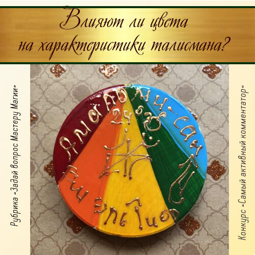 📩 – Влияют ли цвета на характеристики талисмана? Чем Вы руководствуетесь при подборе цветовой гаммы для того или иного талисмана? 📩 – Нет, цвета на Печати Гения никак не влияют на характеристики талисмана. Во время ритуала создания Печати Гения, таким образом, то есть наложением краски на деревянный диск фиксируется энергия и информация. Это ментальная алхимическая графика, в которой важен не столько цвет краски, сколько ее состав, консистенция, а также рисунок линий, периодичность, то есть определенные этапы прорисовки того или иного знака. Как правило, рисунок на печати и цвет краски выбирают авторы, то есть сами Гении. Это полностью их Творение, я - только инструмент, при помощи которого они материализуют свое творчество. Для художника инструмент кисти, а для Гения инструмент - художник, для которого инструмент кисть. Гениям нравится заниматься творчеством, но у них нет физического тела, чтобы что-то создавать на материальном уровне. А в творческом тандеме с человеком они могут