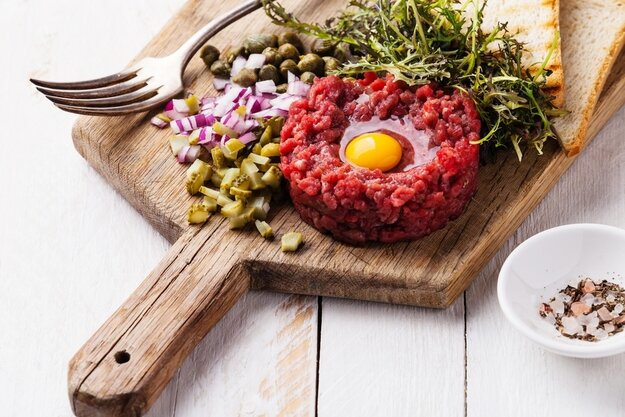 Steak Tartare (рус. стейк по-татарски, или стейк тартар) — блюдо совсем не французского происхождения. Его придумали татаро-монголы. Но предприимчивые французы забрали его себе, переработали и сделали безумно желанным в любое время года. Фактически, стейк тартар, он же boeuf a la tartare – это мелкорубленное сырое филейное говяжье мясо, с добавлением сырого яичного желтка, приправленное соусами и специями. Подается — либо в готовом «собранном» виде, либо в «запчастях». Это значит, что вы сами замешиваете поданные ингредиенты: желток, каперсы, лук, зелень и приправы. Я предпочитаю «собирать» стейк сама, на свой вкус — только так можно избежать обилия лука, которым сдабривают стейки в некоторых ресторанах.