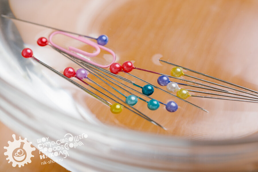 Скажи, пожалуйста, а что плавает на воде и не тонет? Ну, например, дерево, оно не тонет, а еще кусок пенопласта отлично плавает. А вот иголка тонет? Не спеши с ответом, не все так просто – давай проведем эксперимент! Нам потребуется: - небольшой кусочек бумаги; - иголка; - стакан с водой; - небольшое количество жидкого мыла. Что делаем: - положим иглу на кусочек бумаги, а затем – на воду, бумага не тонет, и игла вместе с ней плавает на поверхности воды; - аккуратно начинаем опускать бумагу вниз, игла продолжает плавать; - теперь можно добавить несколько капель жидкого мыла в воду, иголка утонула! Почему же так происходит? Конечно, металл в воде тонет, ведь его показатель плотности выше, чем у жидкости. Но, если аккуратно положить небольшой кусочек металла (иголку) на воду, то он может удержаться на поверхности благодаря поверхностному натяжению воды, свойству молекул воды притягиваться друг к дружке, образуя пленку! (кстати, забавные насекомые водомерки скользят по воде благодаря именн