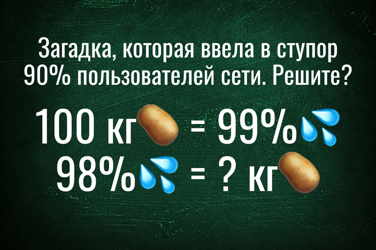 «Парадокс картофеля» — звучит забавно, да? Это ровно до того момента, как вы попытаетесь его разрешить! Перед вами задачка с подвохом: как быстро вы ее решите и сможете ли вообще? Итак, придется напрячь логику и вспомнить пару правил из школьной программы... У вас есть 100 кг картофеля. 99% его массы — вода. Какова будет масса картофеля, если через некоторое время он высохнет так, что в нем останется 98% воды? ▼