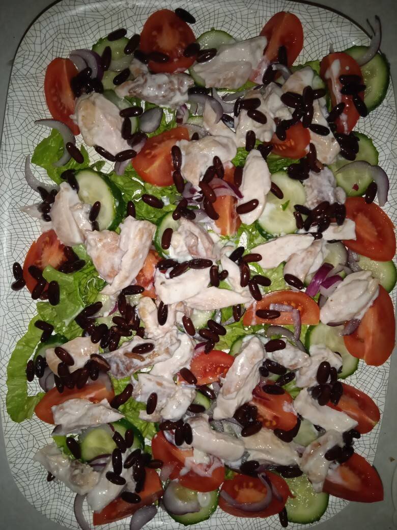 Ингредиенты: куриных бедра без кости, салатных листьев, огурчика, помидорок черри или коктейльных, консервированной фасоли, греческого йогурта, крымского синего лука, Зира, Соль