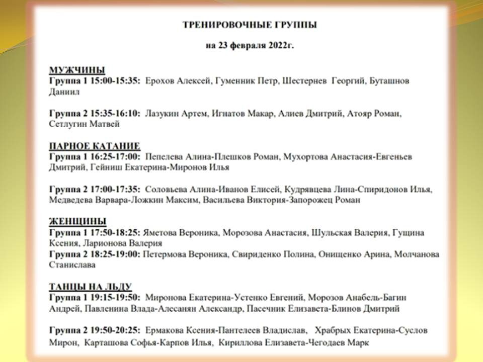 Финал Кубка России в Саранске пройдёт с 23 по 27 февраля. 23 февраля - организационные мероприятия, комиссия по допуску, совещание судей, тренировки. Взрослые соревнования 24 и 25 февраля. 24-го в таком порядке: мужчины, пары, женщины, танцы с 15 до 21 часа. 25-го: мужчины, пары, женщины, танцы с 12 часов 30 минут до 19 часов 15 минут. 26 и 27 февраля - соревнуются юниоры. Участники, как обычно, становятся известны только накануне, но наткнулась в интернете на такой вот список тренировок ( не знаю насколько верно ). Потом сравним. По предварительным данным в списке тренировок на 23 февраля значатся: мужчины группа № 1 - Ерохов, Гуменник, Шестернев, Буташнов. Группа № 2 - Лазукин, Игнатов, Алиев, Атояр, Сетлугин. Женщины: группа № 1. Яметова, Морозова, Шульская, Гущина, Ларионова. Группа №2. Петеримова, Свириденко, Онищенко, Молчанова. Кубок Первого канала по фигурному катанию 5 - 7 марта в Ледовом Дворце Спорта «Айсберг» в г. Сочи. Здесь однозначно
