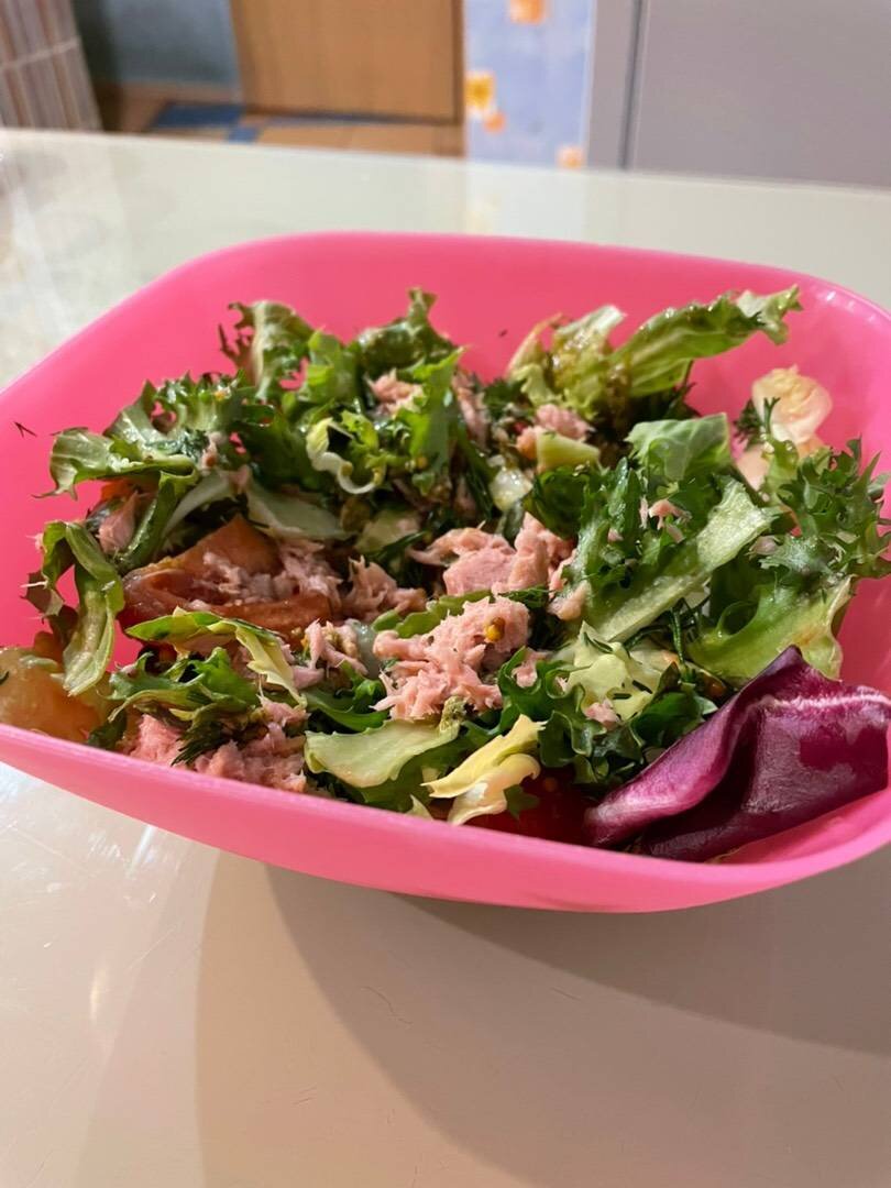 Ингредиенты: Салатный микс, Помидор, Тунец консервированный в собственном соку, Соль, Французская горчица , Соус песто Способ приготовления: В миску кладём салатный микс, добавляем нарезанный помидор, солим, заправляем соусом песто, перемешиваем. Сверху поливаем горчицей и выкладываем консервированный тунец. Также можно добавить натёртый сыр.