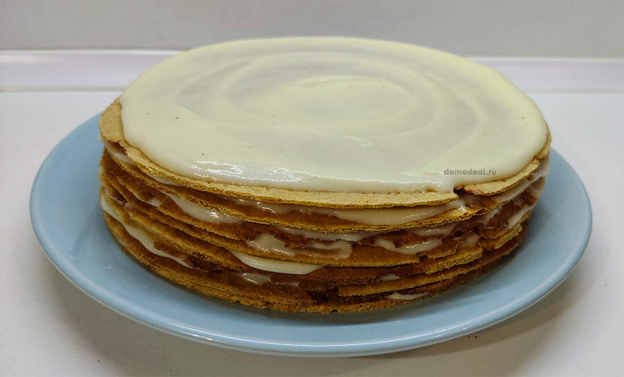 Тесто разделить на 8 частей. Каждую заготовку тонко раскатать, размером в диаметре около 23-24 см. Выпекаем при температуре 180 С до золотистого цвета. Коржи пекутся очень быстро! Готовые коржи затем обрезаем кругом 21 см. Из обрезков сделать крошку для посыпки. Собираем торт: корж -> крем -> корж. На каждый коржик уходит примерно 4 столовых ложки крема.