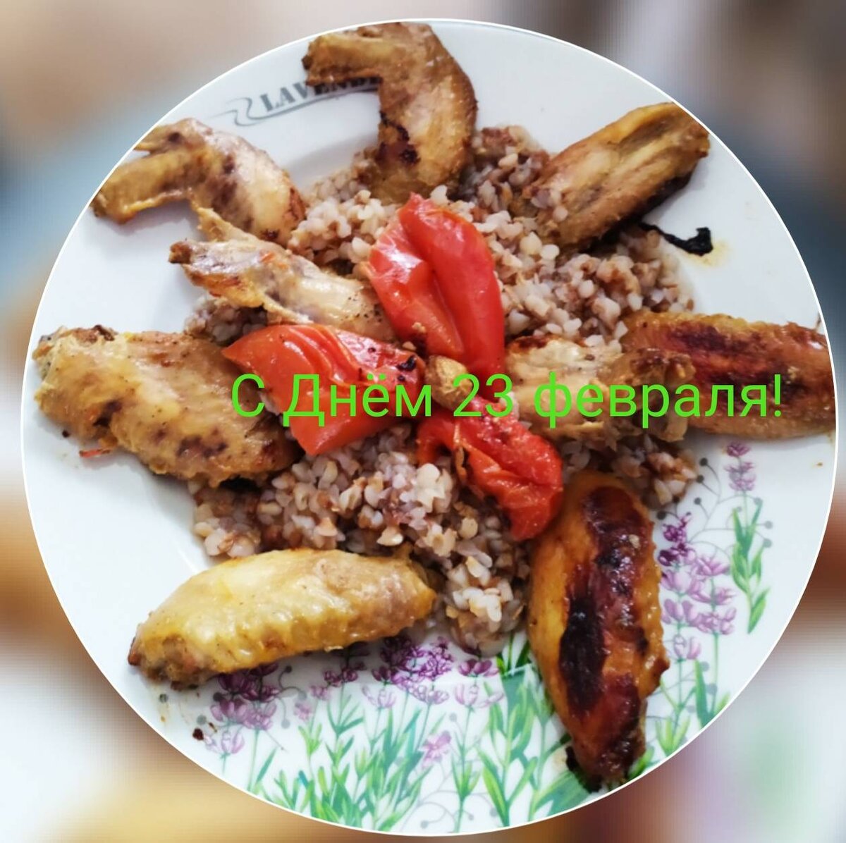 #готовимдлямужчин #23февраля #вторыеблюда #горячее Ингредиенты: отварная гречка, куриных плечиков, соль, черный молотый перец, специи для курицы, мёда и соевого соуса, корки апельсина и сок, чеснока, сока свежего апельсина (или корки) Способ приготовления: Отвариваем гречневую крупу на гарнир, у меня была уже готова, сварена. Берём куриные плечики, моем хорошо, кладём в глубокую сковороду, наливаем немного воды, закрываем крышкой, когда вода закипит воду которая осталась сливаем, сюда же добавляем соль, снова воды но уже кипячёной и охлажденной, специи для курицы, столовую ложку мёда натурального и соевого соуса, сока апельсина, можно корки апельсина измельченных сушёных, зубчики чеснока. Накрываем крышкой, томим покуда не испариться жидкость. На медленном огне до золотистого цвета,сюда же добавляем дольки замороженного нарезаннаго болгарского сладкого перца, обжариваем до румяной корочки Всем приятного аппетита