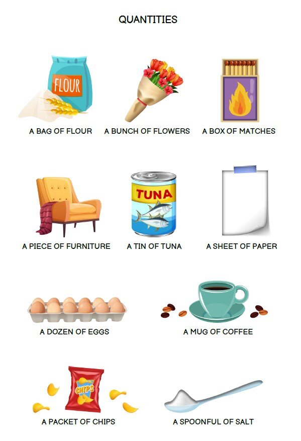 a bag of flour - пакет муки a bunch of flowers - букет цветов a box of matches - коробок спичек a piece of furniture - предмет мебели a tin of tuna - банка тунца a sheet of paper - лист бумаги a dozen of eggs - дюжина яиц a mug of coffee - чашка кофе a packet of chips - пакет чипсов a spoonful of salt - полная ложка соли Подписывайтесь на канал и учите английский с нами!