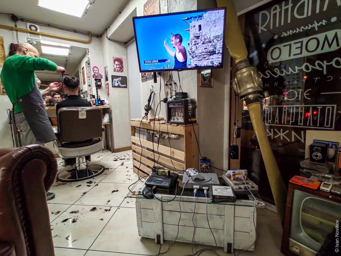 Решил остричься в самом центре города Калининграда. Есть у меня такой прикол: сходить в парикмахерскую в новом городе. На улице Генерала Галицкого, прямо рядом с огромным ТРЦ "Европа" расположился барбершоп "Hardy". Зашли вечером, людей нет. Мой коллега прыгнул в кресло за модной стрижкой, а я принялся разглядывать детали. И тут радости моей не было предела! Ребята собрали здесь многие ценные вещи из детства и юности. Взгляните, сколько старых сотовых телефонов!: Вот это набор! А здесь тебе еще и тетрис, и кассетный аудиоплеер и игра, где под водой надевать цветные кольца на штырьки! А вот ровно такой телефон был у меня. Великий Sony Ericsson K700i. Цветной экран, радио и трехмерные игры. Я обожал его, настоящий айфон середины нулевых! Камера с автофокусом! Я записывал в него музыку, ужимая формат мп3 так, чтобы весь альбом группы у меня занимал всего 30 Мб! Всего же памяти в нем было аж 64 Мб) Тогда в цветном экране моего К700-го умещался целый мир, а теперь только взгляните на экра