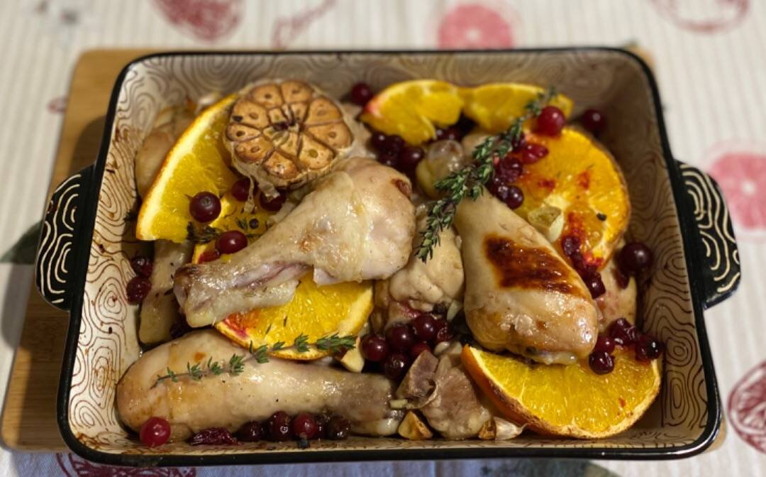 #куриныеголени #рецептыскурицей Ингредиенты: Куриные голени, Апельсин, Чеснок, Соевый соус , Мёд жидкий , Масло оливковое , Чеснок, Клюква, соль, перец , Тимьян Способ приготовления: Для начала готовим маринад: смешиваем соевый соус, мёд, оливковое масло, выдавленный через пресс чеснок, соль и перец. Добавляем сок с одного апельсина. Все хорошо перемешиваем. Помещаем в маринад куриные голени и убираем в холодильник на 6-12 часов. В посуду для запекания выкладываем голени, второй апельсин режем ломтиками и выкладываем к курице вместе с разрезанной пополам головке чеснока. Посыпаем клюквой (часть оставляем для подачи) и тимьяном. Готовим в заранее разогретой до 180 градусов духовке 45-60 минут (в зависимости от духовки). Достаём из духовки, украшаем клюквой и тимьяном. Приятного аппетита 😘