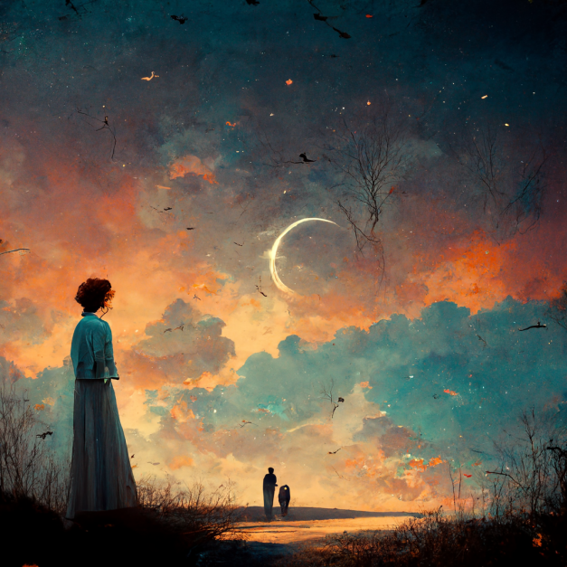 Вечером в день рождения принцессы, Альда и Котт сбежали в Серый лес, который не поддавался магии погодной ведьмы и цвел, опыляя все кругом. В воздухе витали чудесные запахи пыльцы цветов. Опустившийся вечер добавлял особый пьянящий аромат свежести и свободы. Закат очаровывал своим великолепием и красками. Альда невольно уставилась в небо, разглядывая тусклый полумесяц на фоне бархатного апельсинового полотна небес.