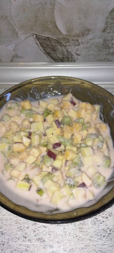 Нарезать кубиками и залить йогуртом.