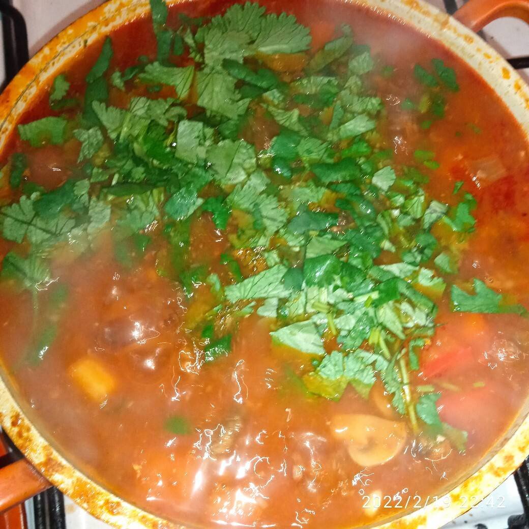 Навеян рецепт осмотром своих закромов и плохой погодой. Не хотелось идти в магазин по мокрому снегу🤪😁😁 #23февраля Ингредиенты: Фасоль красна, Баклажан средний, Лук репчатый , Морковь средняя, Томат паста , Шампиньоны около , Свекла средняя, Кинза , стебель сельдерея, Чеснок , Соль, перец, растительного масла, И самое главное колбаски Чоризо. У меня готовые мои. Способ приготовления: Замачиваем фасоль часа на 2. Не забываем промыть. Ставим варить мытую свеклу до готовности (2 ч.) Да у меня Чоризо готовое, своё, можно также использовать фарш. См мой рецепт колбаски Чоризо. Из фарша делаем или мал. Фрикадельки (размером с ноготь) или разбиваем в похлебке. Как в соусе болоньезе) В кастрюле разогреваем масло и пассеруем лук (его можно и прижарить. Немного другого вкуса даст) и добавляем морковь доводим до средней мягкости. Готовим остальные овощи. Вводим грибы и доводим до готовности и кинзу но только мелко рубленый корень и стебель. И фасоль. Когда это всё стало красивым вводим всё оста