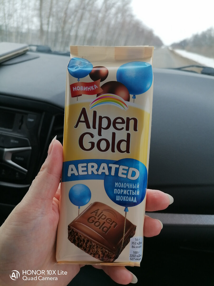 Привет, друзья. Возвращаясь домой с подругой из Ельца, она меня угостила шоколадкой. За то что я ей составила компанию в поездке. Она у меня любит кататься везде, а одной скучно. Вот периодически и меня дёргает с собой, как говориться развеяться от всех проблем и домашних хлопот. Итак вернёмся к шоколаду. Альпен гольд воздушный, это что - то новенькое. Я такую ещё не видела, у нас в деревне кроме молочного и с изюмом никаких и нет. Я вообще люблю сладости и подруга об этом знает. Подкармливает меня. 🤭 Молочный, пористый шоколад. В бежевой привлекательной обертке. На ней нарисованы воздушные шары. Внутри на шоколаде выбито название, а на некоторых плитках нарисовано солнце. Распоковав шоколад пошёл сразу аромат на всю машину каким то крем - брюле, и на вкус нежнейший. Я в восторге, мне понравился. Подруга есть не стала, она не любит пористый шоколад. Она у меня любит вишню с коньяком. 😆 Губа не дура. Ну и хорошо мне больше достанется. 🤭Пока ехали я её лопала, одна одинешенька