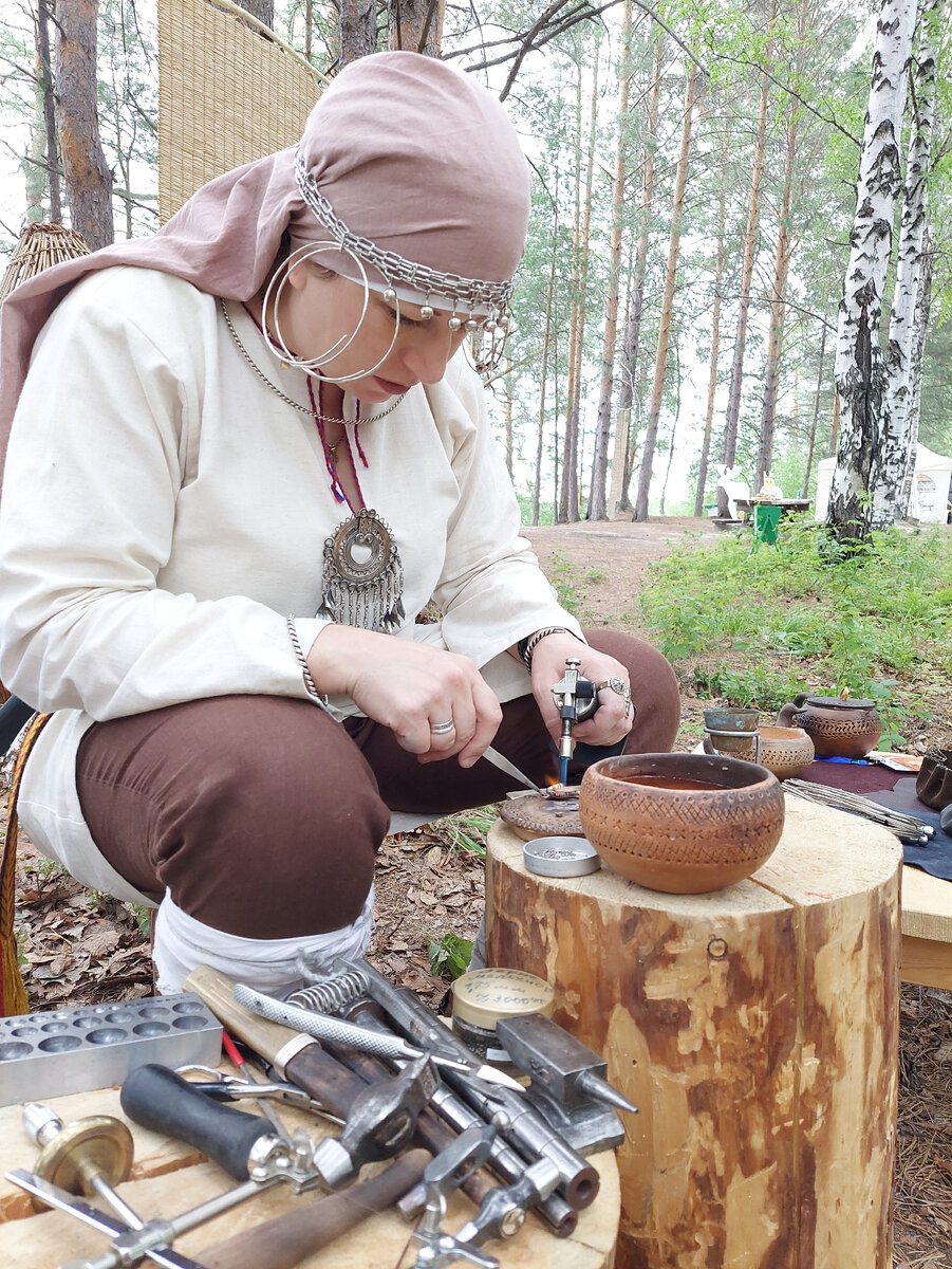 Сваткова Наталья Германовна, художник-конструктор БУ ХМАО-Югры «Центр ремесел», Победитель в номинации «Лучший мастер по ковке и литью». Наталья выполнила реконструкцию пары арочных шумящих подвесок с тремя подвесками- бубенчиками на цепочках. Аналогами изделия послужили шумящие подвески, найденные на территории ХМАО-Югры, Сургутский район, могильник Киняминский II. Материал – мельхиор. Техники: ковка, выколотка, пайка, чернь, гнутьё. Подобные шумящие подвески были весьма популярным украшением в Средние века и получили широкое распространение на всей территории Западной Сибири, Приуралье, Прикамье. Украшение носили женщины многочисленных финно-угорских и славянских народов. Его носили в различных вариантах: вплетали в косы на косоплетках, нашивали на подол, подвешивали в виде височных подвесок на головное украшениях и подвешивали на пояс.