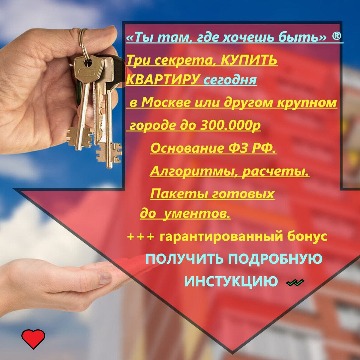 «ТЫ ТАМ, ГДЕ ХОЧЕШЬ БЫТЬ» Три секретных, законных способа КУПИТЬ КВАРТИРУ в Москве или другом крупном городе РФ до 300.000 р. 1) Проработанная выжимка статей законодательства. 2) Готовые документы. 3) Все данные, списки, расчеты. ЖМИ 👉 +++ БОНУС ЗАБРАТЬ 👉 ИНСТРУЦИЯ Информация подготовлена, проверенна и одобрена Международной Академией Крут. Нам доверяют. Официальный сайт Международной Академии Крут. https://academy-krut.turbo.site/